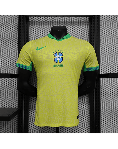 A nova camisola do Brasil 2024 apresenta uma textura completa que celebra a vasta herança natural e cultural do país e sua história de brilhantismo dentro de campo. Da música às araras, do Pão de Açúcar às praias mundialmente famosas, todo o Brasil está contido neste padrão de textura rica. O escudo está de volta ao seu lugar. Assim como na lendária camisola de 2004, o escudo da CBF está na frente e no centro da nova camisa do Brasil 2024.